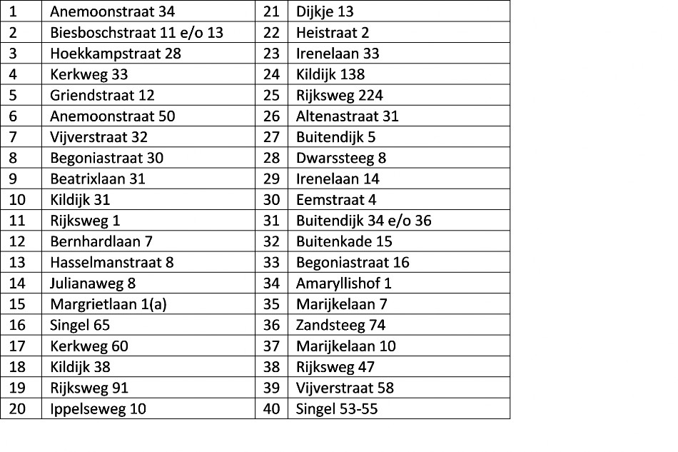 Van alle teams die meespeelden ontvingen we 38 oplossingen retour. De eerste al op zaterdag, de laatste twaalf even voor 22.00 uur op dinsdag 5 mei. Van de 38 inzenders waren er maar liefst tien die alle veertig adressen goed noteerden. Zij krijgen zaterdag 9 mei om 10.00 drie nieuwe foto’s toegestuurd. Het team dat als eerste de juiste adressen bij de foto’s weet te vinden mag zich de winnaar noemen van de Fotopuzzel Nieuwendijk. Natuurlijk laten we jullie nog even weten welk team dat uiteindelijk geworden is.