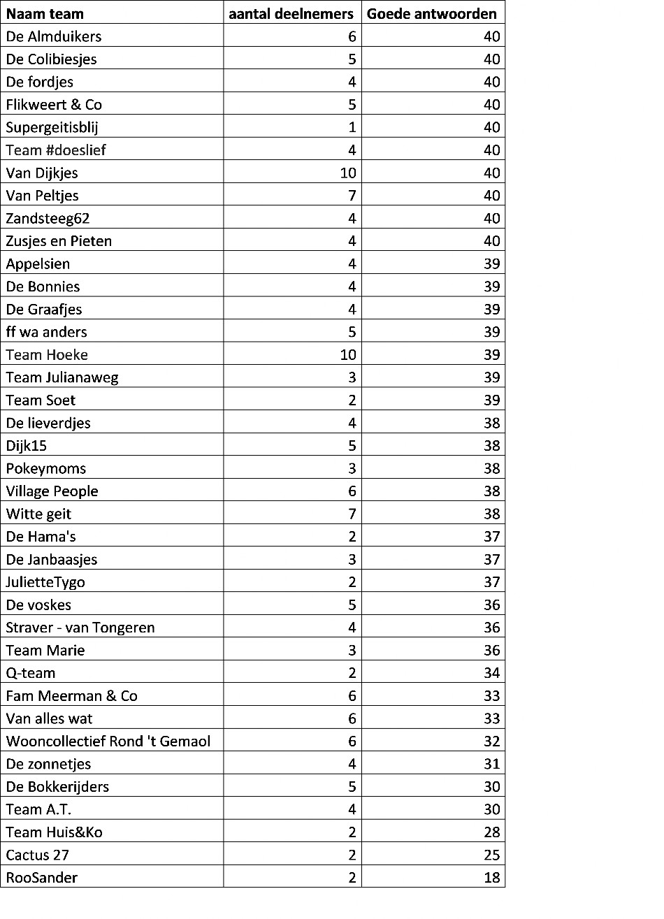 Dan hieronder de oplossing van de fotopuzzel en de (voorlopige) uitslag. Welk team zich echt de winnaar mag noemen van de Fotopuzzel Nieuwendijk zal zaterdag duidelijk worden.